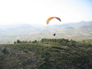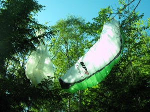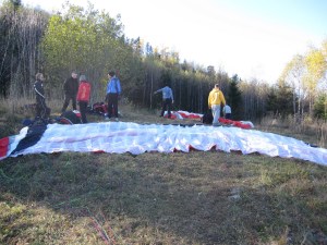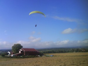 Fikk en veldig fin start, endel vind og vi gikk flere meter bakover før vi kom oss fremover og ble løftet ut og opp. Fy fader, det var kraftige forhold. Penetrerte greit. Etter få sekunder var vi 50 meter over start og fløy rett ut i retning motsatt side av dalen. Det løftet lenge utover og jeg kjente at det var heftig!Penetrerte greit, men slapp for sikkerhets skyld opp trimsystemet. Passasjeren, en ung kar fra Solbergmoen holdt seg fast og hadde det bare fint, mens jeg tenkte på om vi kom til å møte mer vind om vi steg høyere nå? Ikke så keen på å rygge inn i skauen med tandem. Valgte derfor å fly gjennom alt som var av løft. Og det løftet kraftig. Ikke ofte jeg har så kraftig løft i det hele tatt, og attpåtil med tandem og i midten av oktober! Varioen hylte og bar seg og peaket på +5.1 over sandtaket – dagens trigger. Helt vilt midt i oktober!Da vi stod trygt på landing etter å ha passert tilsvarende i synk, så vi Lasse komme utover. Han måtte speede hele tiden og hang lenge nokså stille. Ble litt spennende for han å komme seg over høyspenten, men det gikk greit.