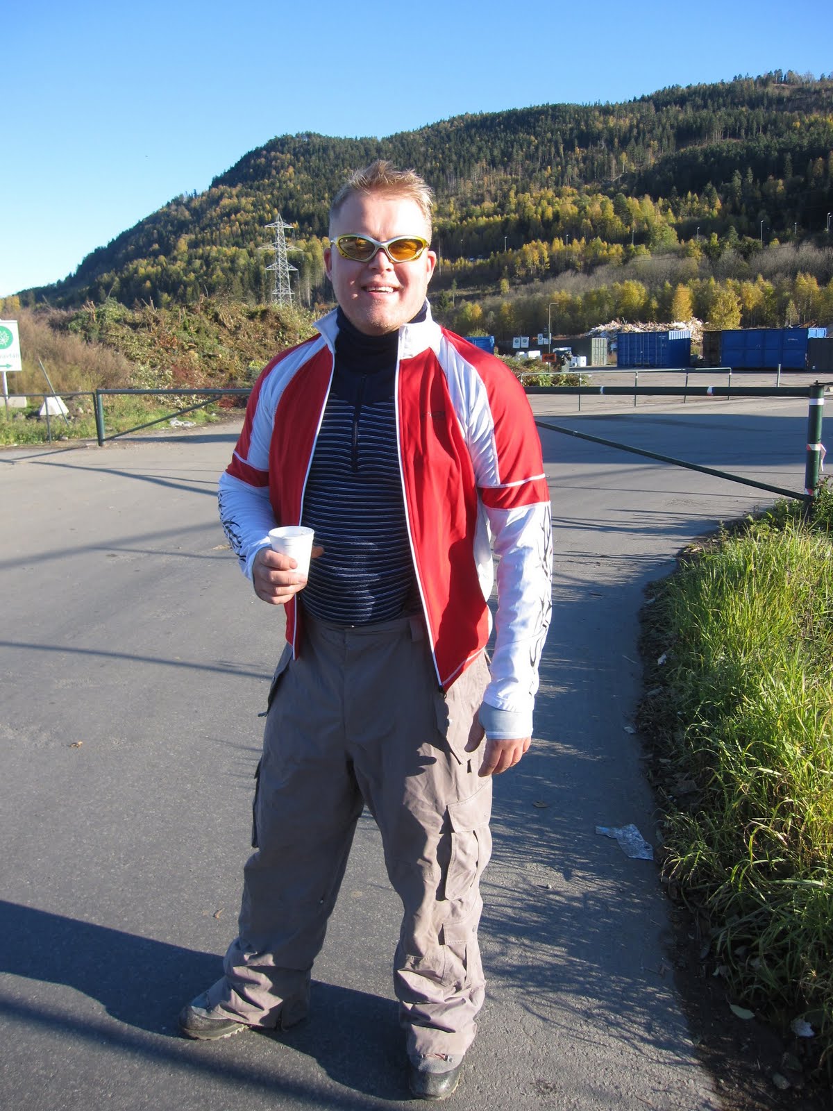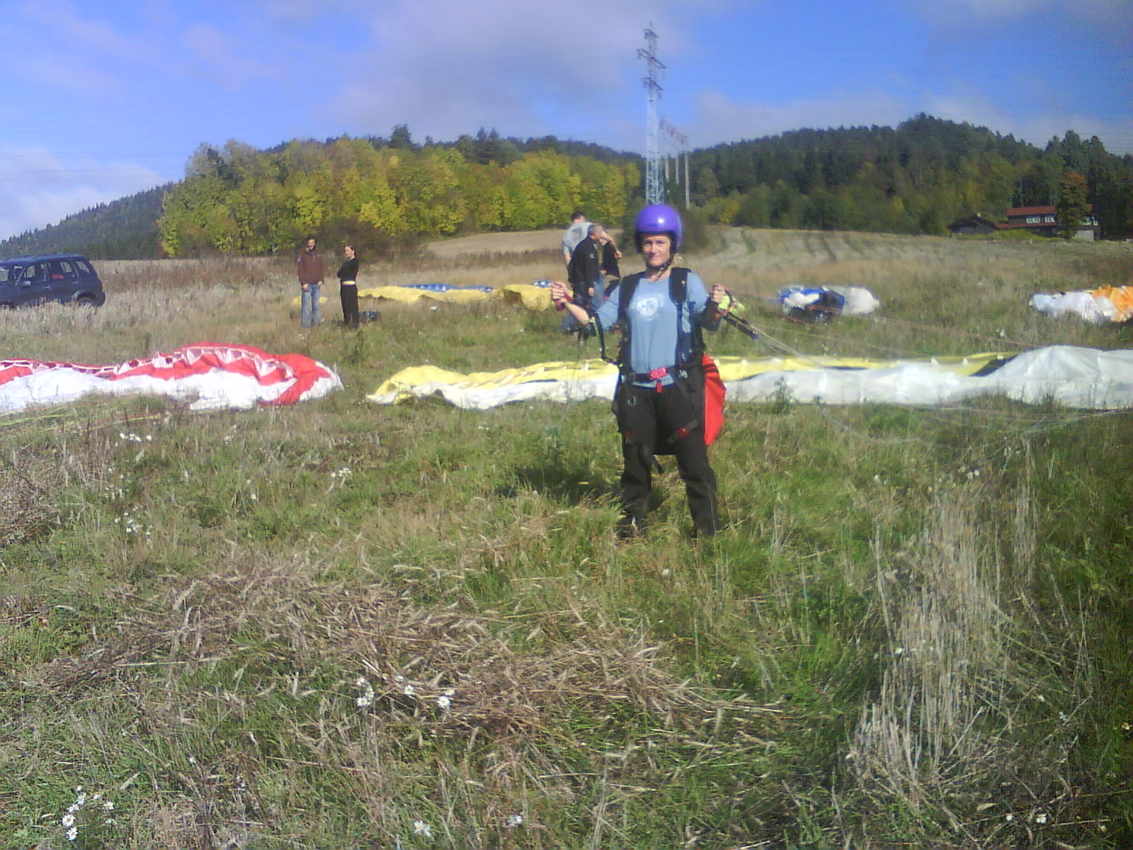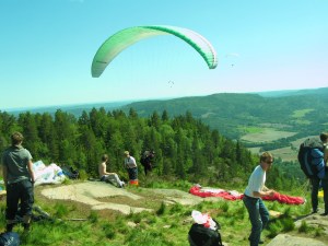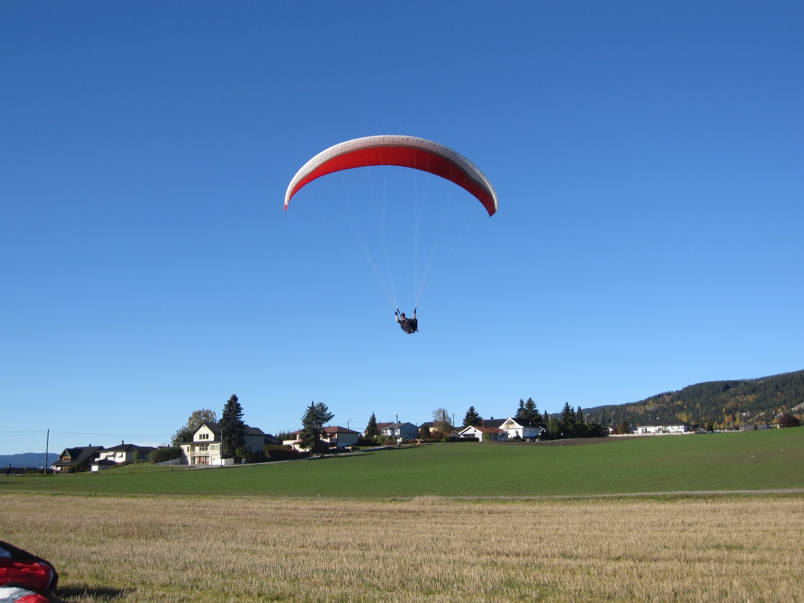 Fikk en veldig fin start, endel vind og vi gikk flere meter bakover før vi kom oss fremover og ble løftet ut og opp. Fy fader, det var kraftige forhold. Penetrerte greit. Etter få sekunder var vi 50 meter over start og fløy rett ut i retning motsatt side av dalen. Det løftet lenge utover og jeg kjente at det var heftig!Penetrerte greit, men slapp for sikkerhets skyld opp trimsystemet. Passasjeren, en ung kar fra Solbergmoen holdt seg fast og hadde det bare fint, mens jeg tenkte på om vi kom til å møte mer vind om vi steg høyere nå? Ikke så keen på å rygge inn i skauen med tandem. Valgte derfor å fly gjennom alt som var av løft. Og det løftet kraftig. Ikke ofte jeg har så kraftig løft i det hele tatt, og attpåtil med tandem og i midten av oktober! Varioen hylte og bar seg og peaket på +5.1 over sandtaket – dagens trigger. Helt vilt midt i oktober!Da vi stod trygt på landing etter å ha passert tilsvarende i synk, så vi Lasse komme utover. Han måtte speede hele tiden og hang lenge nokså stille. Ble litt spennende for han å komme seg over høyspenten, men det gikk greit.