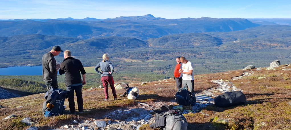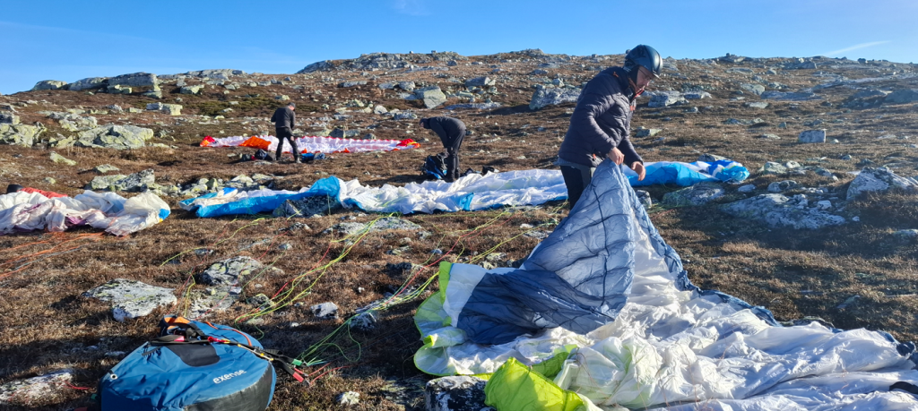 På samling på jordet ved Sandvatn er Aina og Ivar, Robert, Vegard og Bjørn, alle erfarne piloter. Og jeg. Jeg føler umiddelbar inkludering i hele gruppa, en god trygghet, jeg aner ikke hva som venter. Robert har lånt en bomnøkkel og vi kjører opp 500 høydemeter, på med sekker og klare for nye 500 på beina. Gaustatoppen i ryggen, 28 km unna, ruver i landskapet under en skyfri himmel. Hallelujastemning! Det er et lett vestlig drag rett inn, kanskje litt for lett?