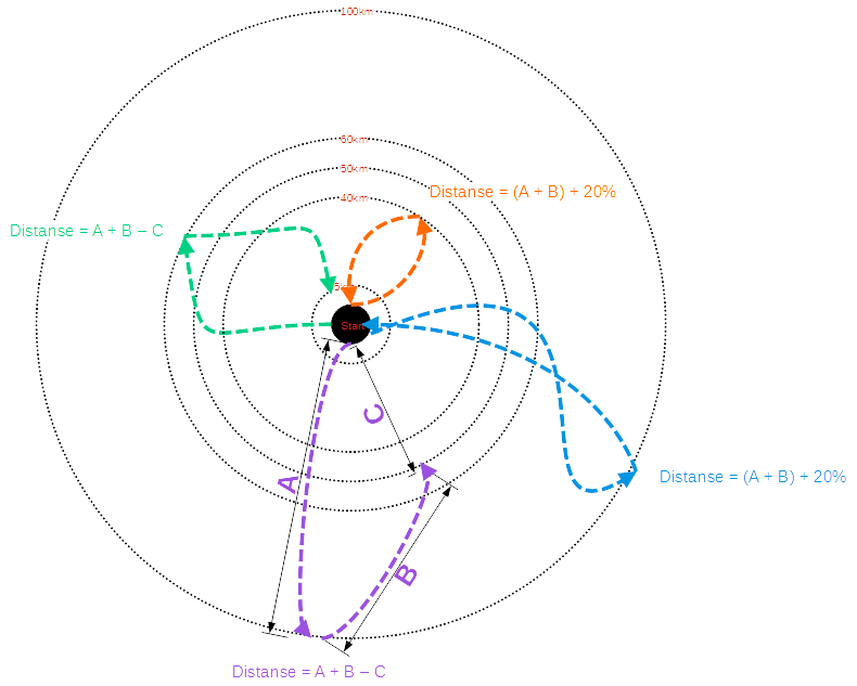 Distanse måles i luftlinje fra start til vendepunktet og tilbake igjen til start. Vendepunktet er der deltaker har hatt lengst distanse til start i løpet av konkurransen. Dersom man ikke når tilbake til start innenfor satt tidsvindu trekkes gjenstående distanse fra totalen.